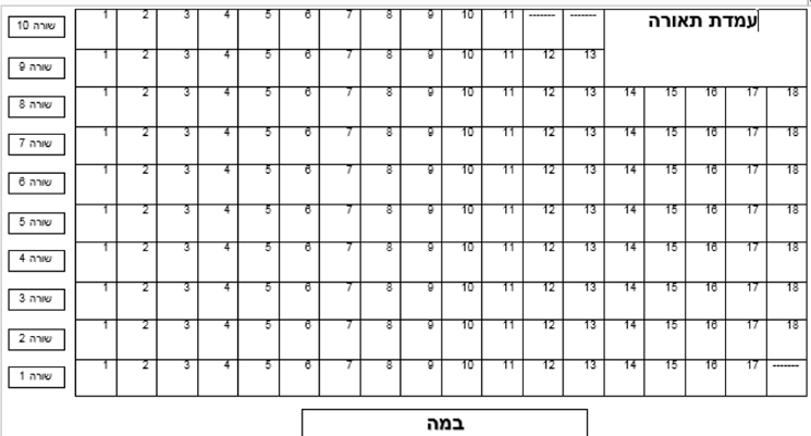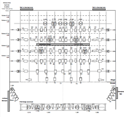 ת"א | מפת האולם167 מושבים, עמדת התאורה מול הבמה | מפת תאורהמחשב תאורה MA2TZ |